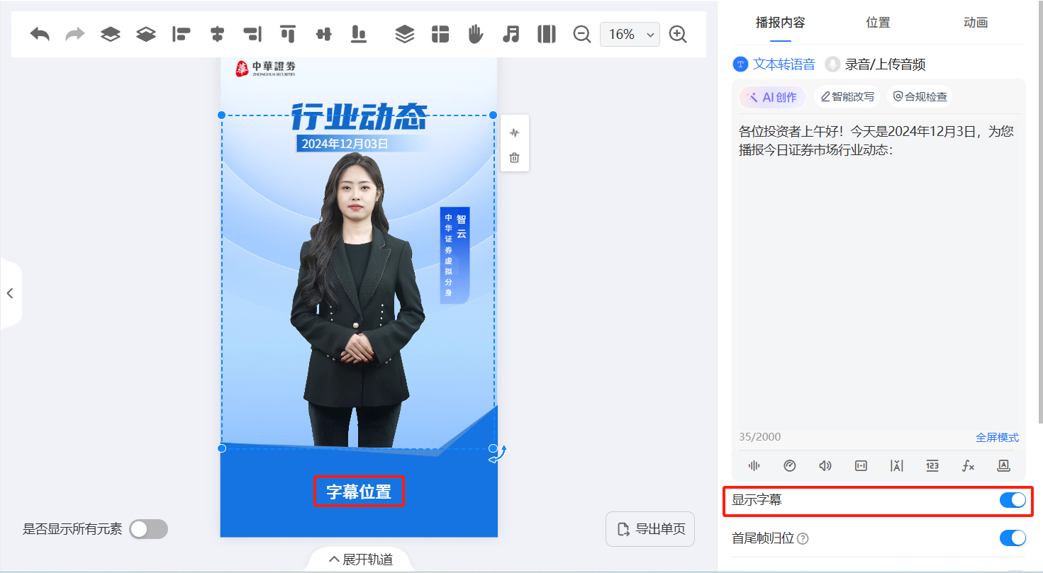 如果模板上没有“字幕位置” 选项,选中“数智人”(如果是配音,在模板空白处点击),右侧面板会出现“播报内容”面板,找到 “显示字幕” 选项,点击开关按钮将其开启。开启后,模板面板上会出现 “字幕位置” 选项。
