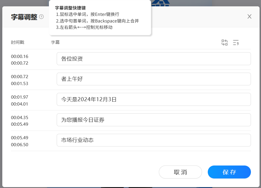 如果希望对当前字幕再次调整(换行、合并等),可以点击“字幕调整”,弹出弹框后对字幕进行换行、合并行等操作。