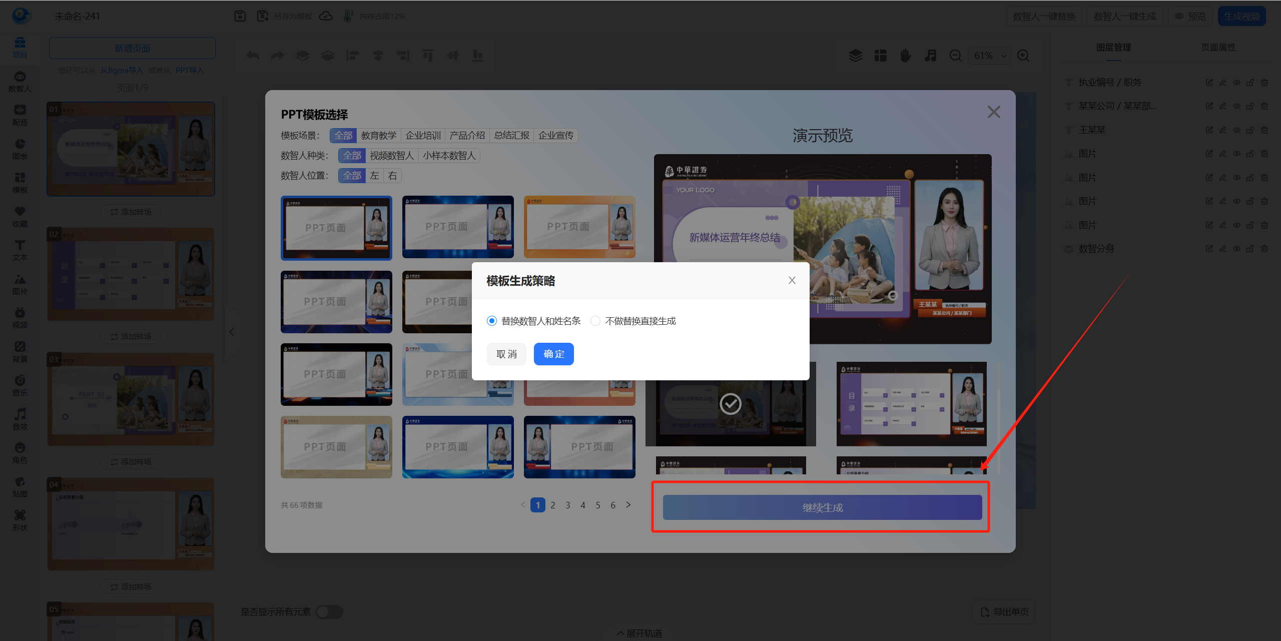 点击继续生成,出现两个选项:【替换数智人和姓名条】和【不做替换直接生成】