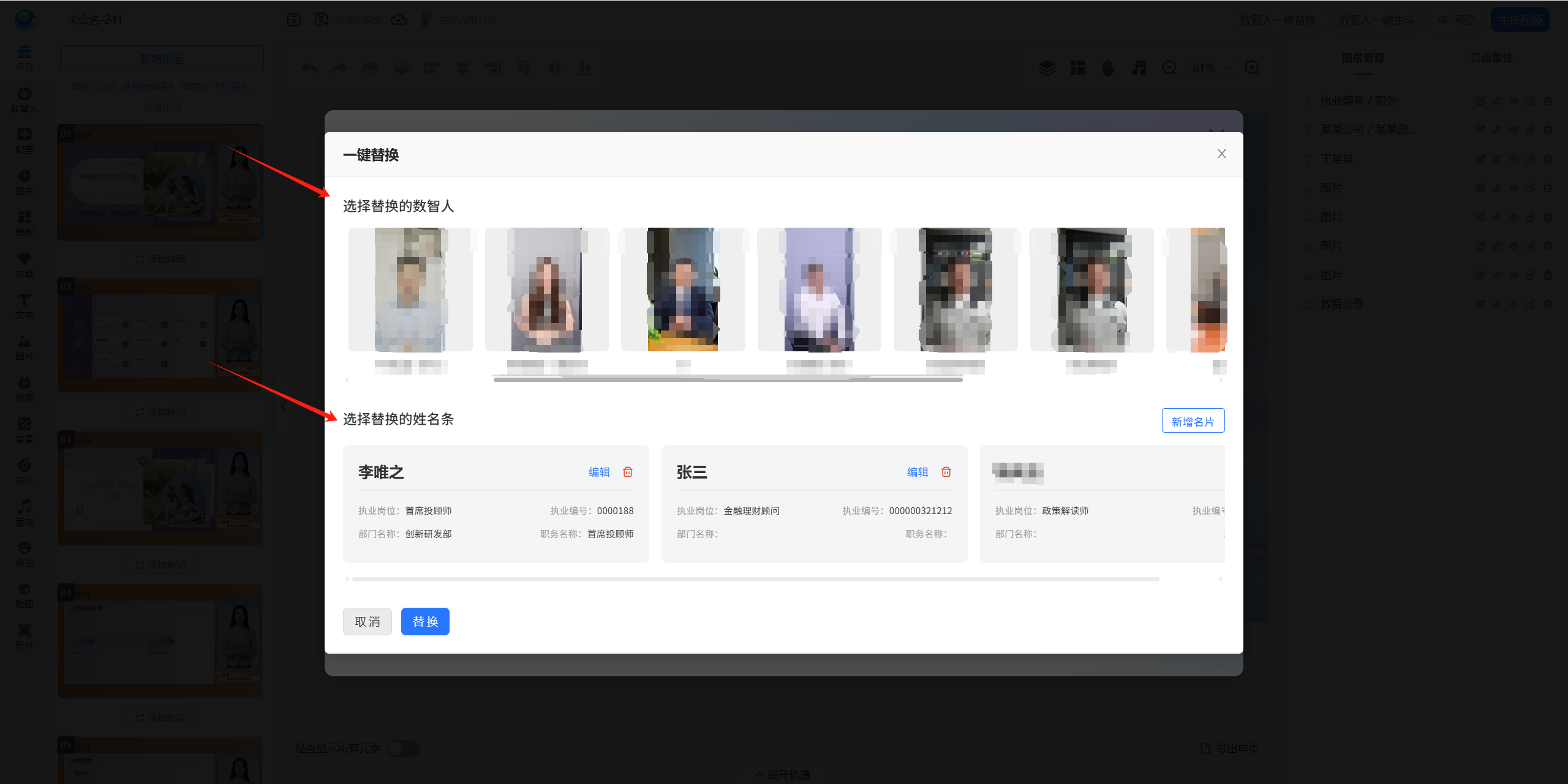 用户可以选择在平台中训练的专属数智人形象,以及定制专属姓名条内容,平台支持一键替换所有页ppt模板数智人和姓名条,无需手动修改;