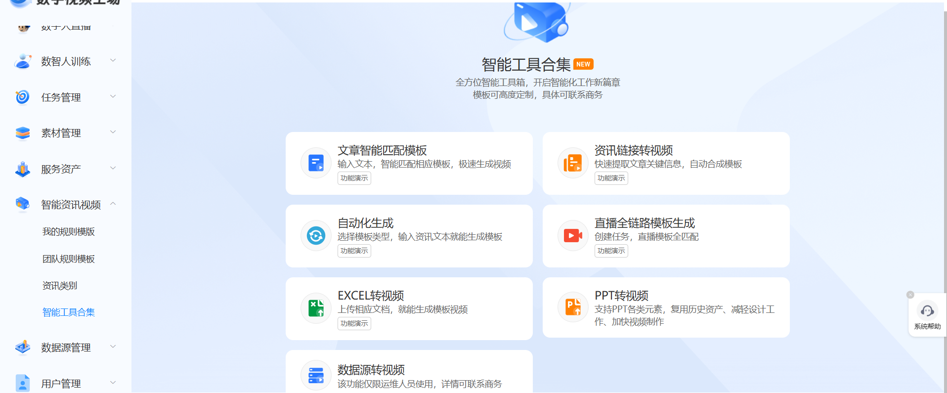 ▸ 入口1 智能工具合集:智能工具合集包含了多个智能化工具入口,其中就包含了PPT 导入功能。如下图所示,选择智能工具合集菜单,可以找到PPT转视频选项,点击"PPT转视频",选择需要转换的PPT文件,系统自动会解析文件,选择需要导入的页和元素,即进入模板编辑页,这是的模板就是PPT中的内容。