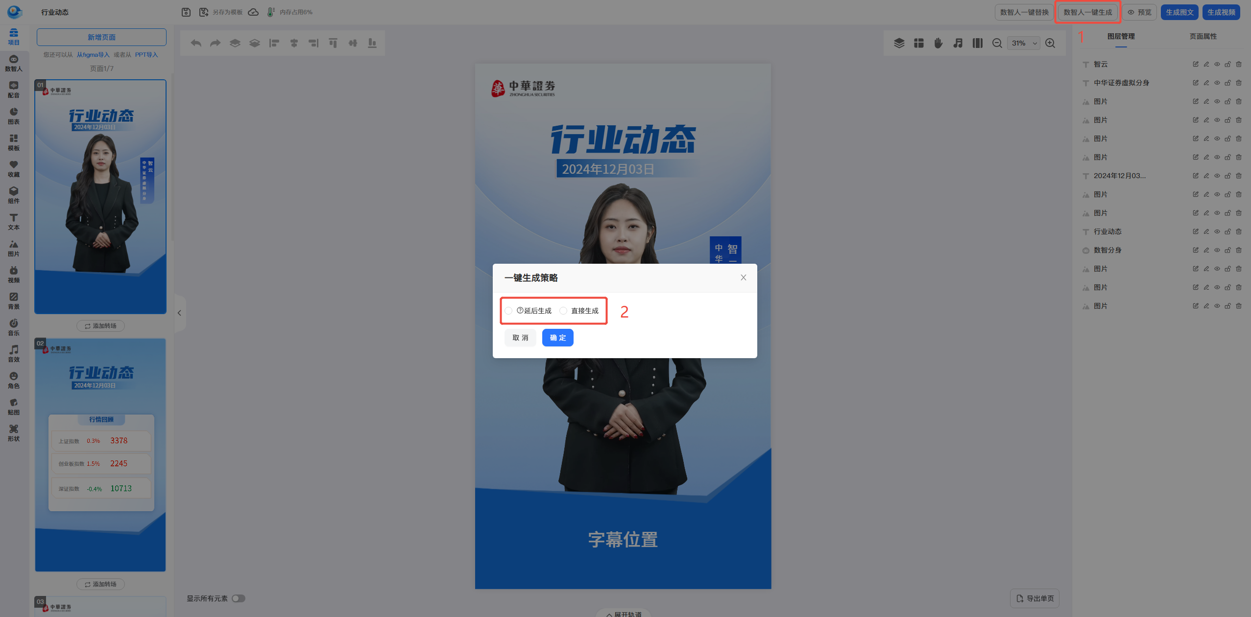 数智人模板制作中,添加或修改文案后,如何选择数智人播报的生成方式。