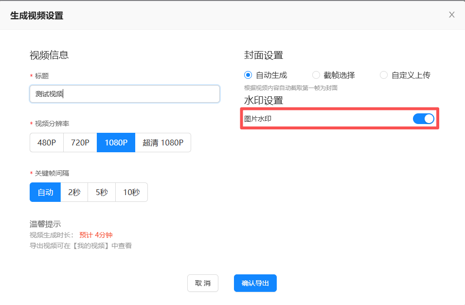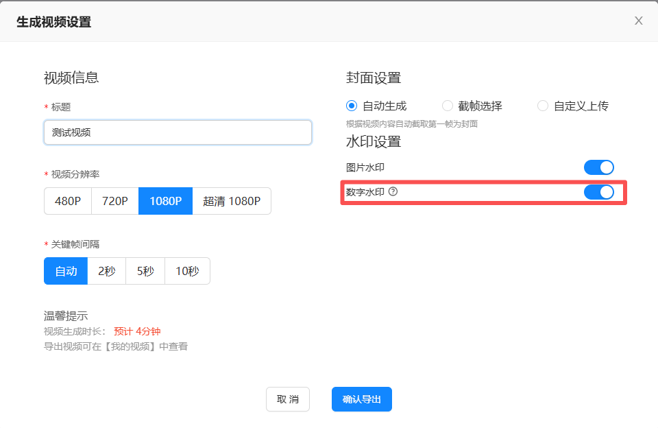 根据需要开启或关闭暗水印开关,开启后视频生成环节将显示数字水印选项。