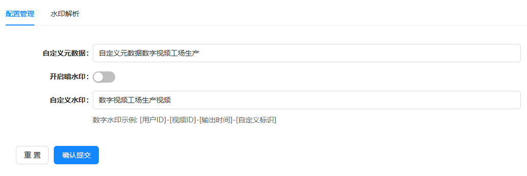 合规溯源配置:支持配置视频自定义元数据与暗水印功能,满足视频溯源与内容合规管理需求。