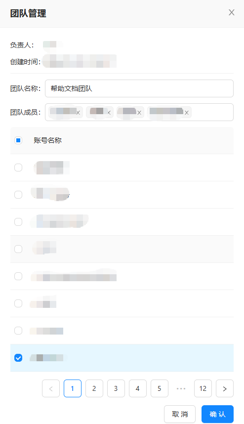 点击【创建团队】,输入团队名称,选择需要加入该团队的用户,确认后完成创建。创建者自动成为团队负责人。