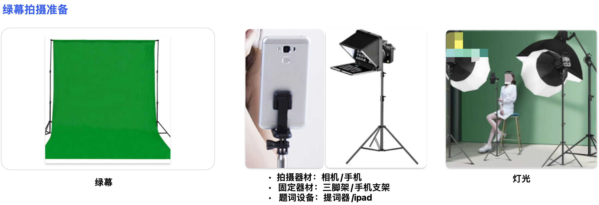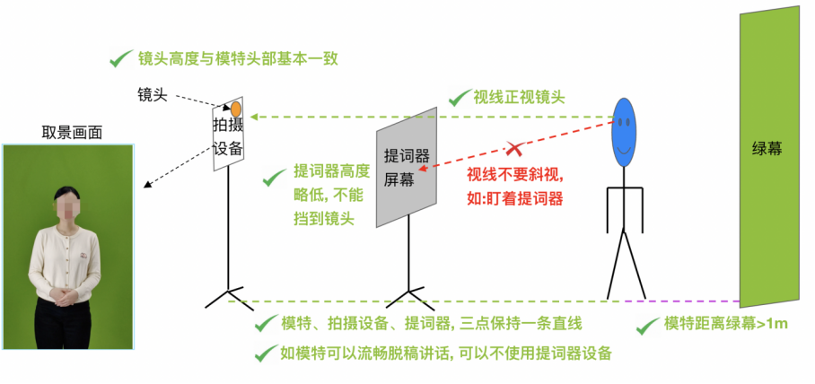 ▸人物距离绿幕1.5m以上,注意人物皮肤和衣服及桌子不要有绿色反光。(如果拍全身,脚下需要有绿幕)。