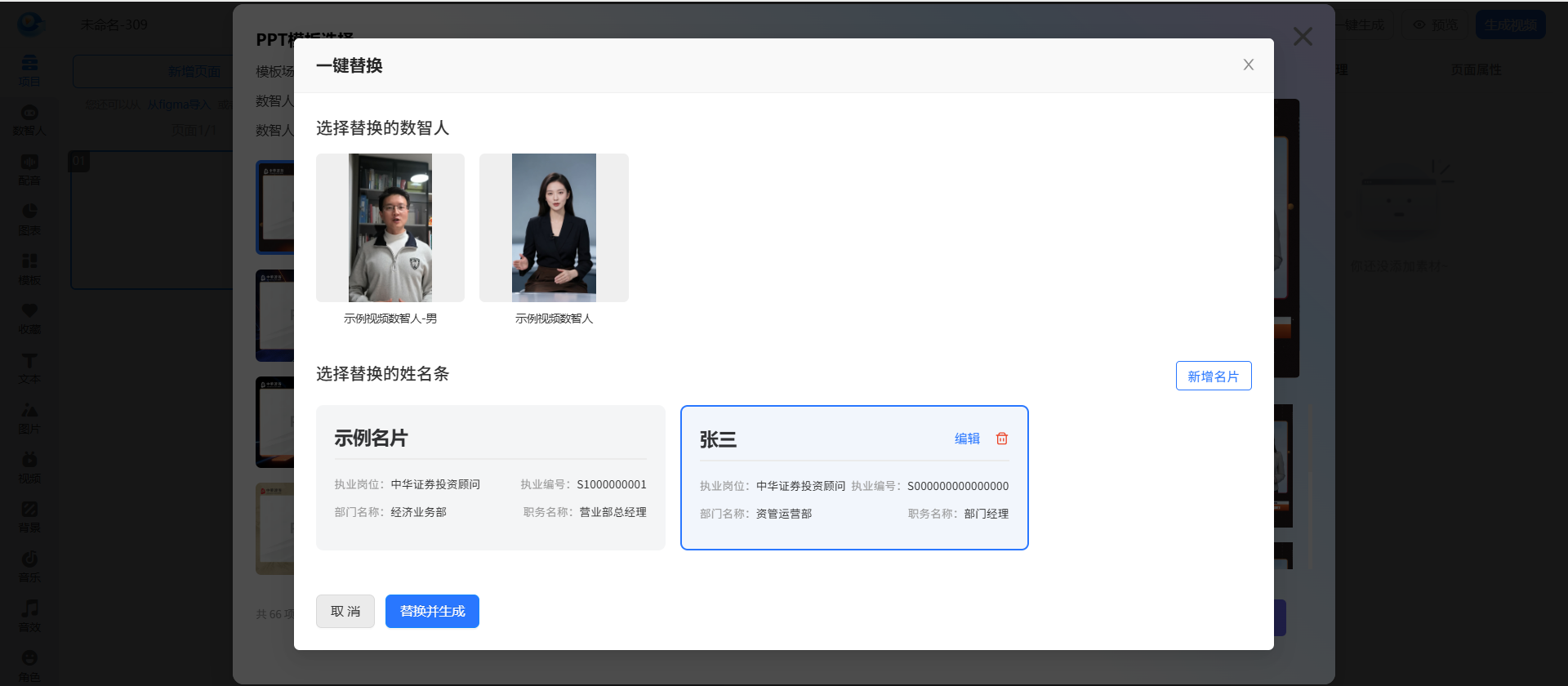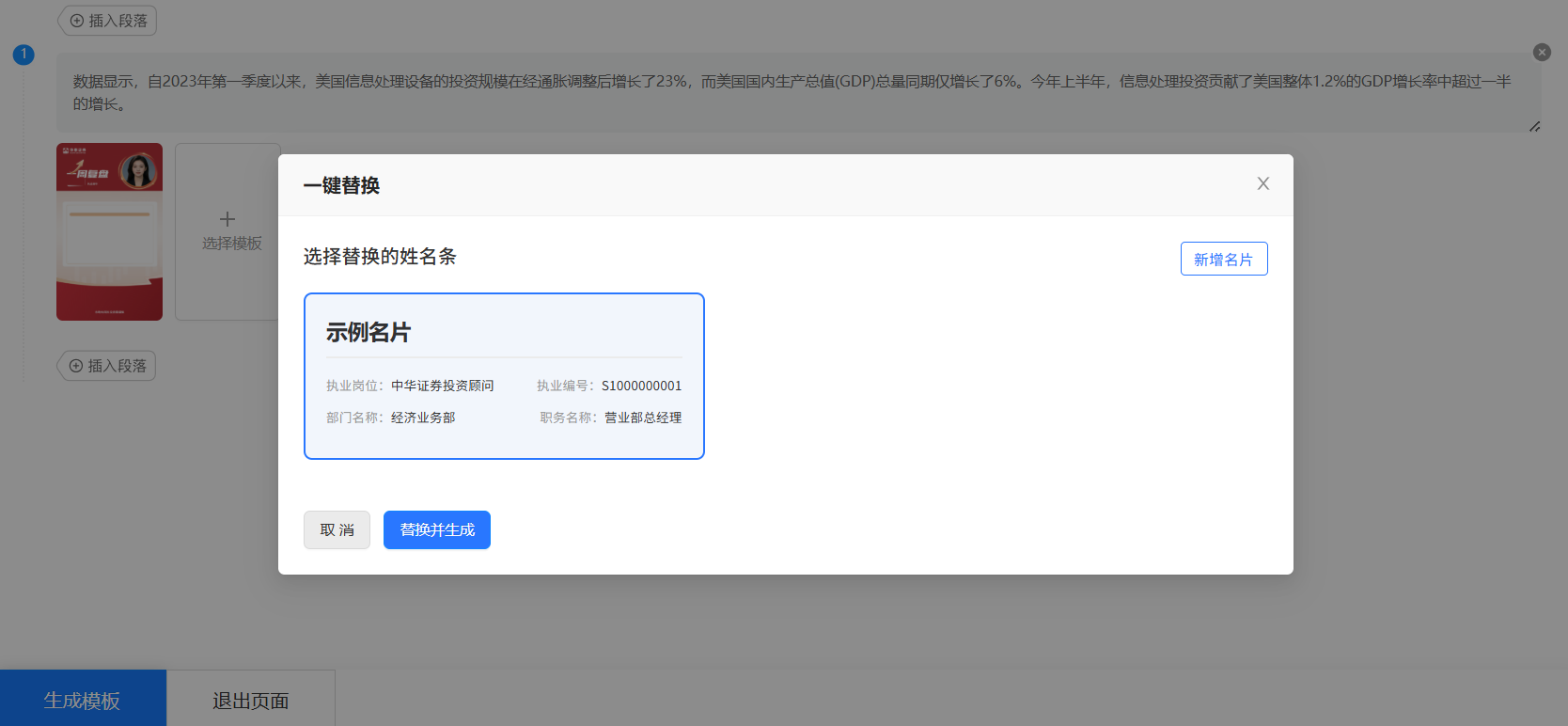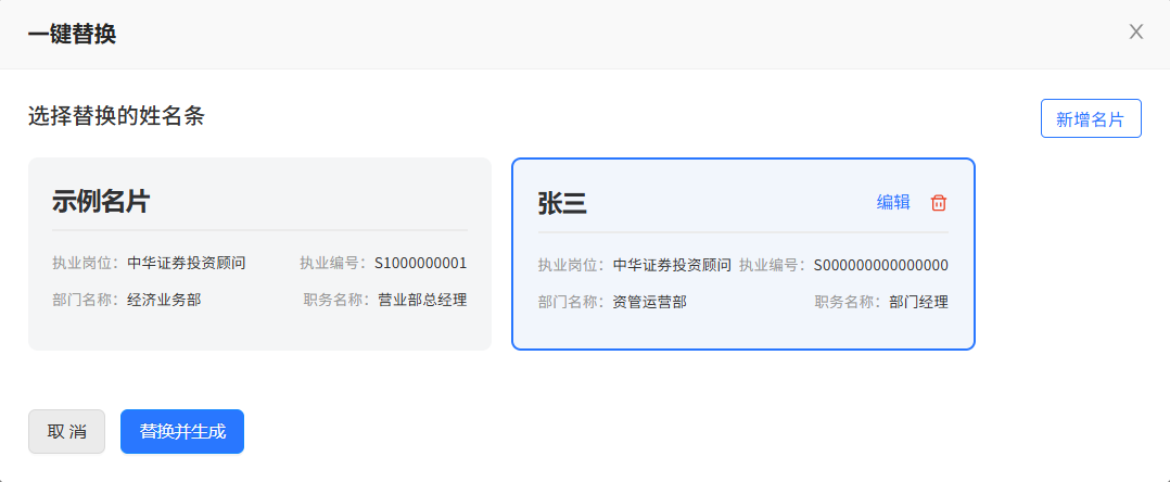 根据下图所示的示例名片维护姓名条信息,选中希望替换的名片信息,转化模板后将自动带入名片信息并智能填充。